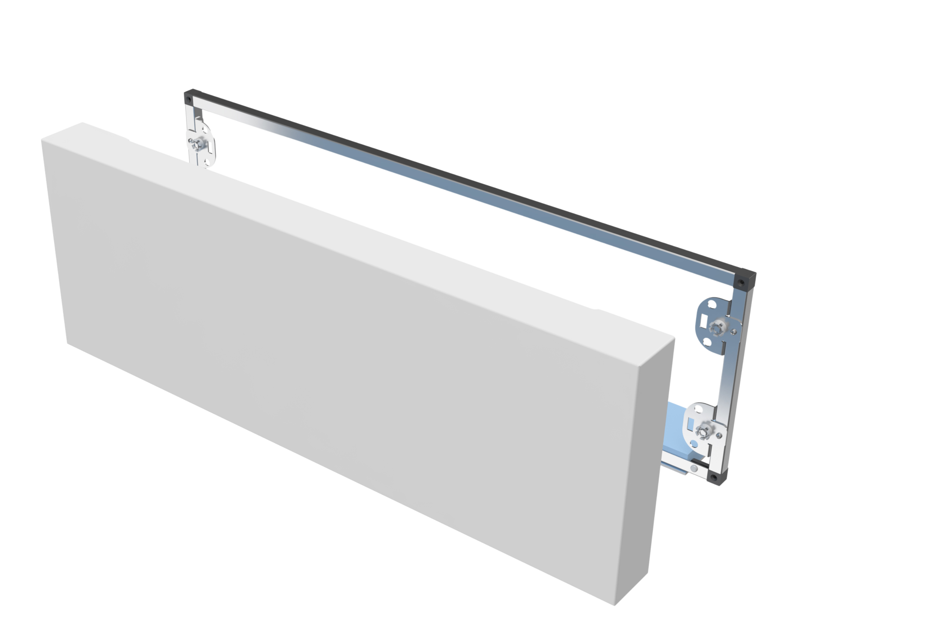 Telaio metallico fissato alla muratura. La cover si aggancia mediante un sistema a pressione.